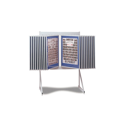 This floor-standing multi-panel displayer provides a 90-degree viewing angle of presentation materials. Each unit accommodates 10 or 20 panels and is available with a light gray or beige steel frame in three-panel sizes to choose from